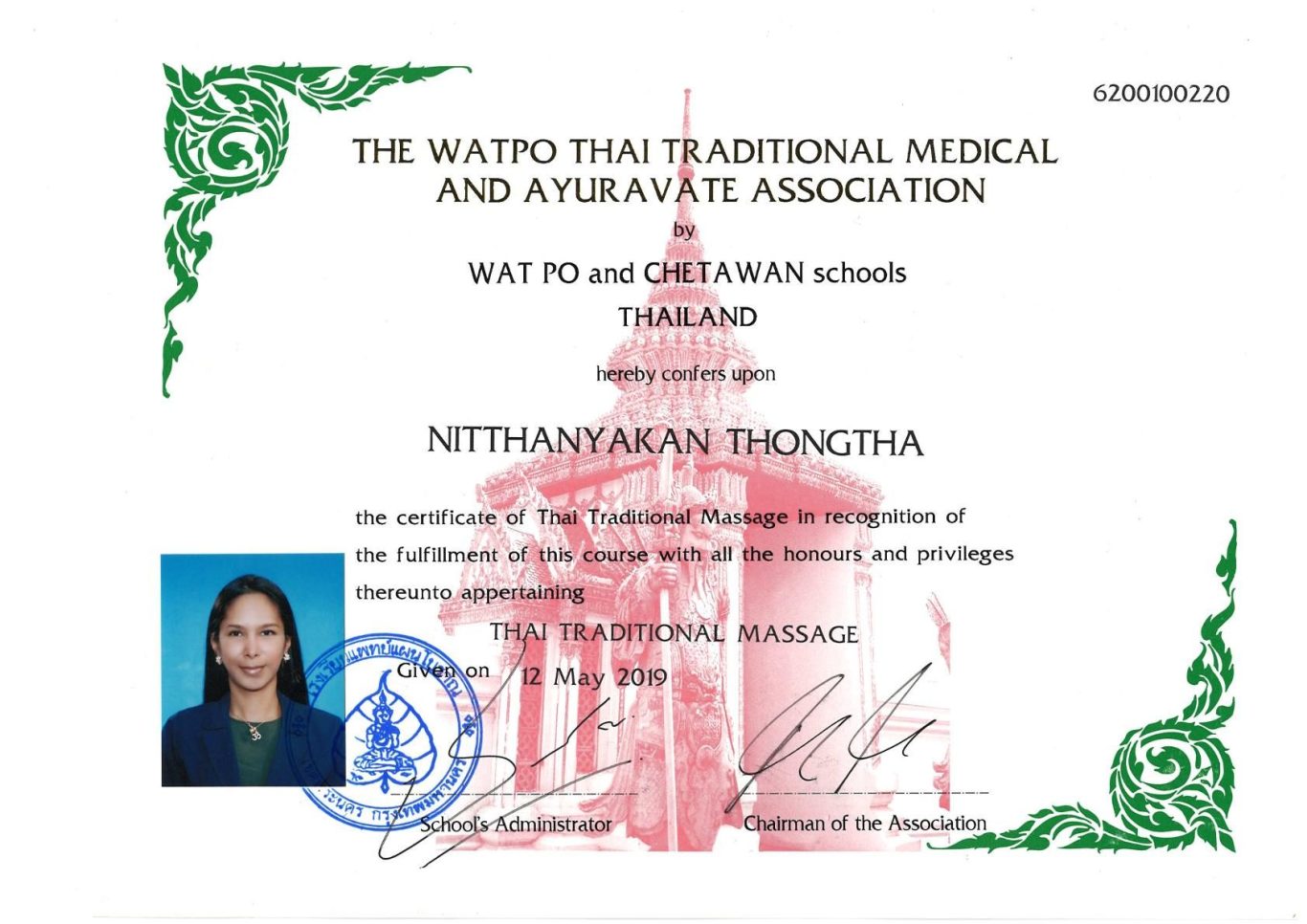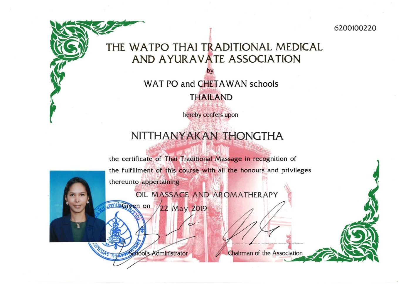 Unsere Gründerin wurde direkt in Thailand ausgebildet und trägt die angesehenen Zertifikate der Wat Po Thai Traditional Medical and Ayuravate Association, einer der weltweit renommiertesten Schulen für traditionelle Thai-Massage. Diese Ausbildung garantiert höchste Qualität und Authentizität.